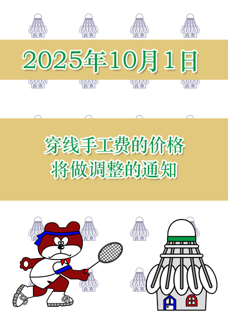 感謝一直一來對我们 Shuttle House梭家 的支持与爱戴。 Shuttle House梭家(大阪难波店、东京上野店) 2025年10月1日起穿线手工费的价格将做调整。 穿线手工费 (含税价格 不包含球线)...
