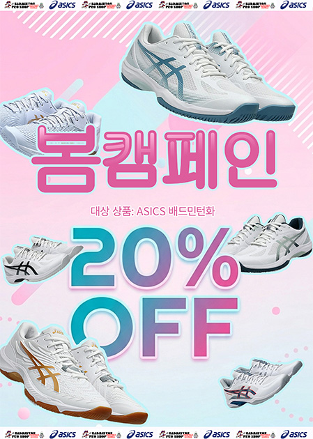 항상 이용해 주셔서 감사합니다. 고객님께 감사의 마음을 담아 봄 캠페인을 진행합니다! ASICS 배드민턴화가 지금 20% 할인! 절호의 기회를 놓치지 마세요!